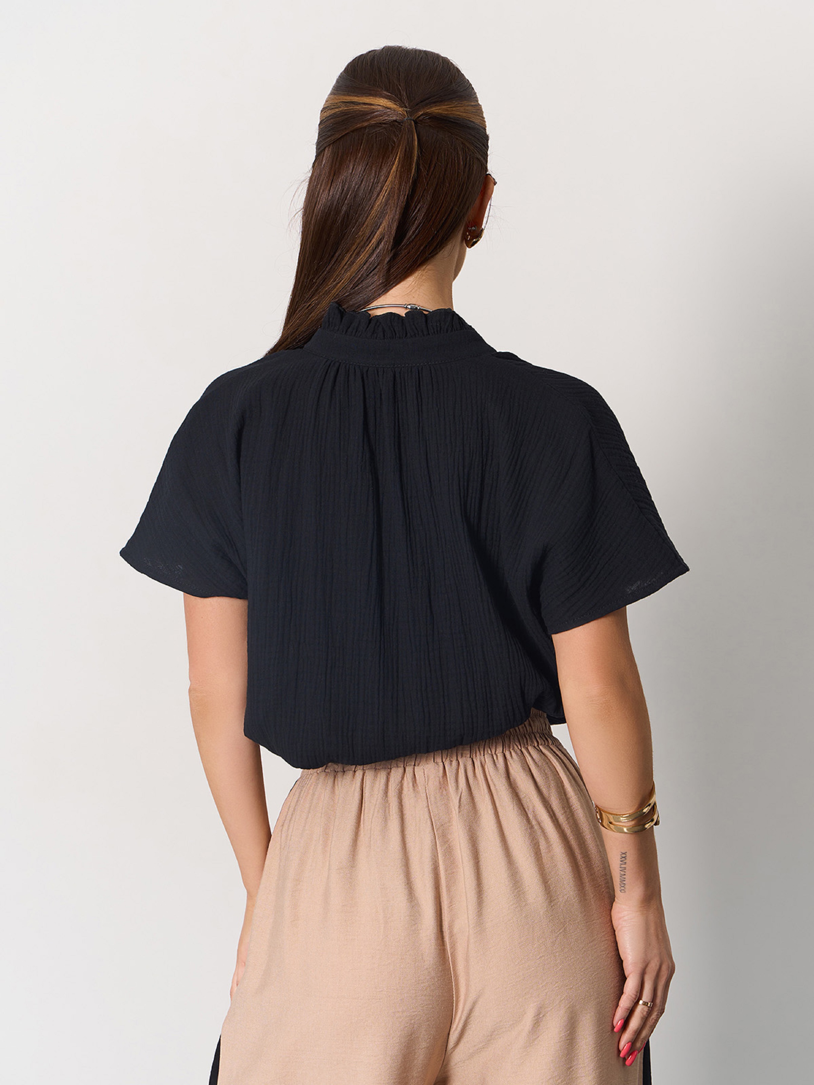 Легка блуза прямого вільного крою з асиметричним низом, виготовлена з текстурованого чорного мусліну. Модель з короткими цілісними рукавами, V-подібною горловиною та ніжними рюшами на комірі-стійці. Напівобхват: Груди: S (57), M (59), L (61), XL (63), XXL (65), 3XL (67); Довжина виробу - 65-68*; Рукав - 9; Тканина: Низької еластичності. Склад: 100% бавовна