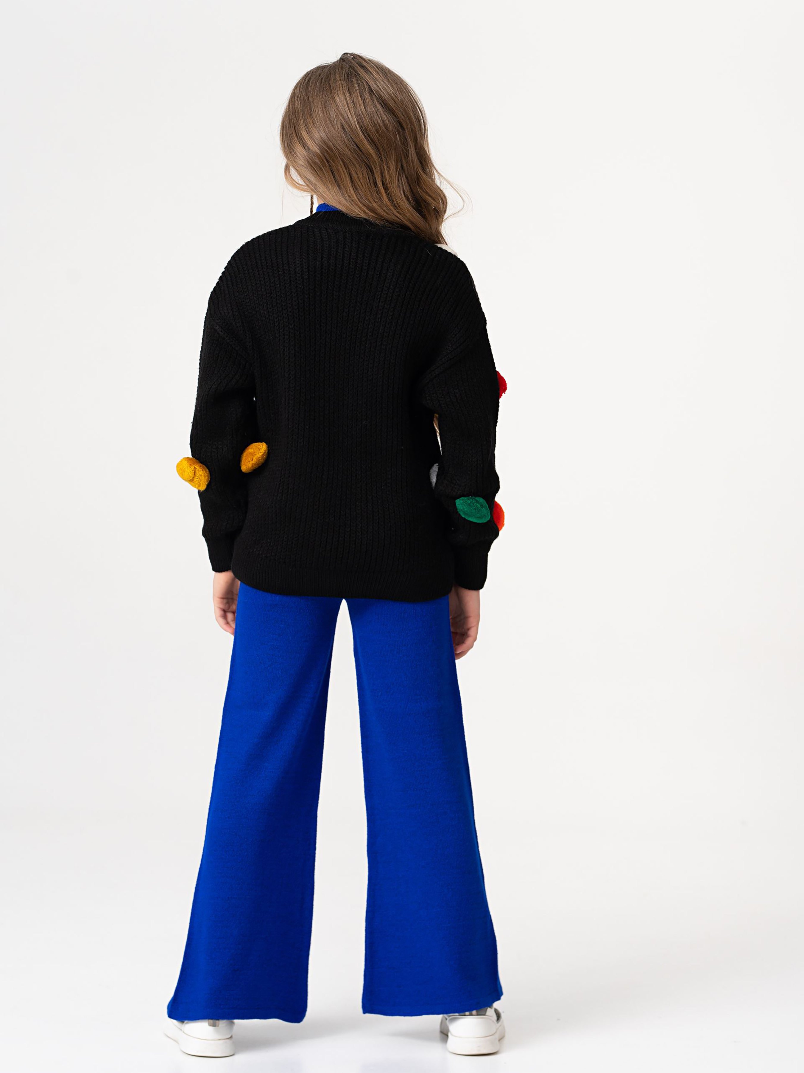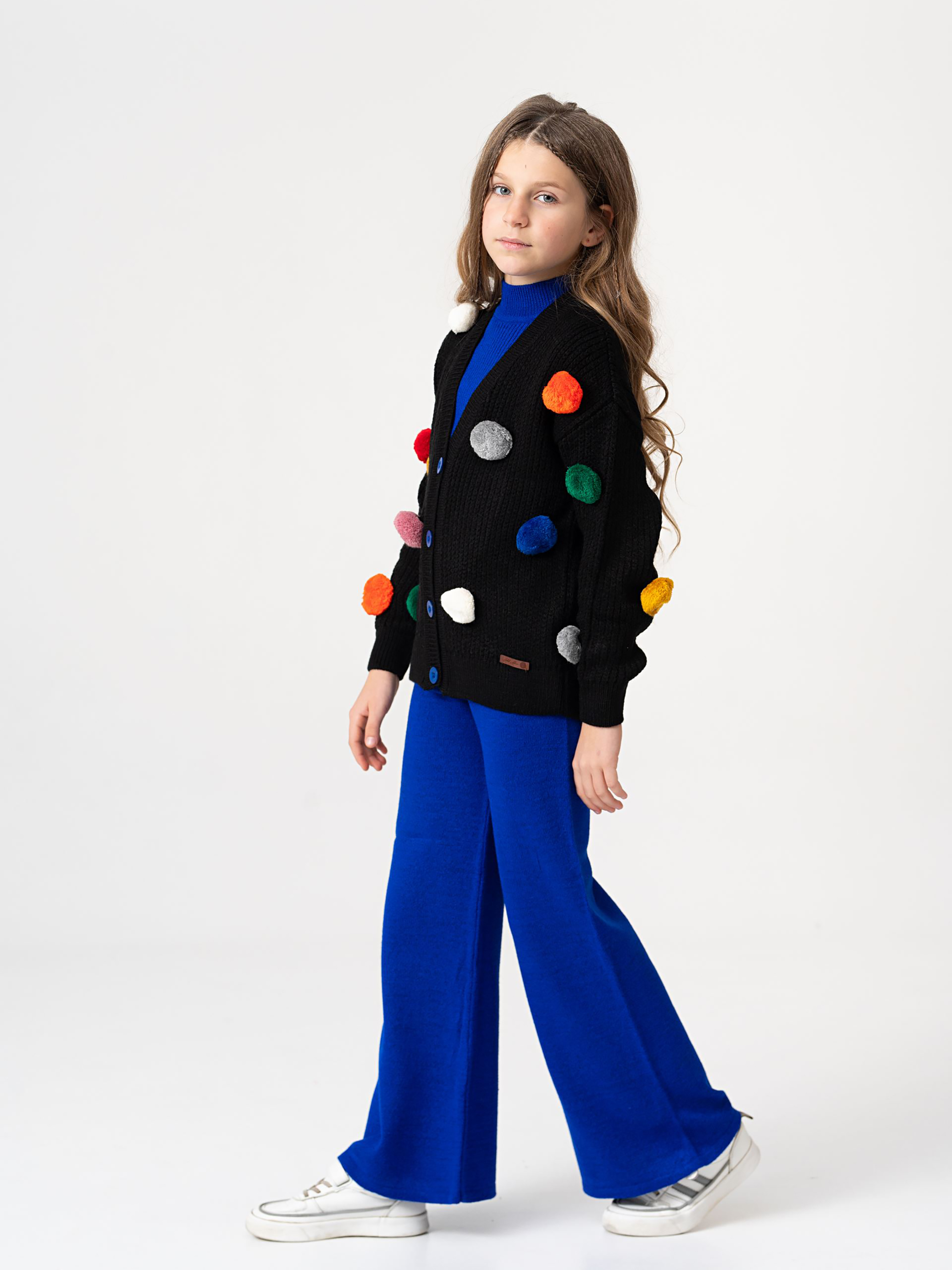 Деталі моделі: костюм-трійка (гольф без рукавів, штани та кардиган). Колір синій з чорним. Кардиган із V-подібним вирізом. Застібка – гудзики. Декор - великі та кольорові хутряні помпони. Гольф однотонний, синього кольору із коміром-стійкою. Штани прямого крою, трохи розширені до низу. Пояс на резинці. Середня висота по талії. Кишень немає. Матеріал - трикотаж. Сезон – осінь-зима-весна.