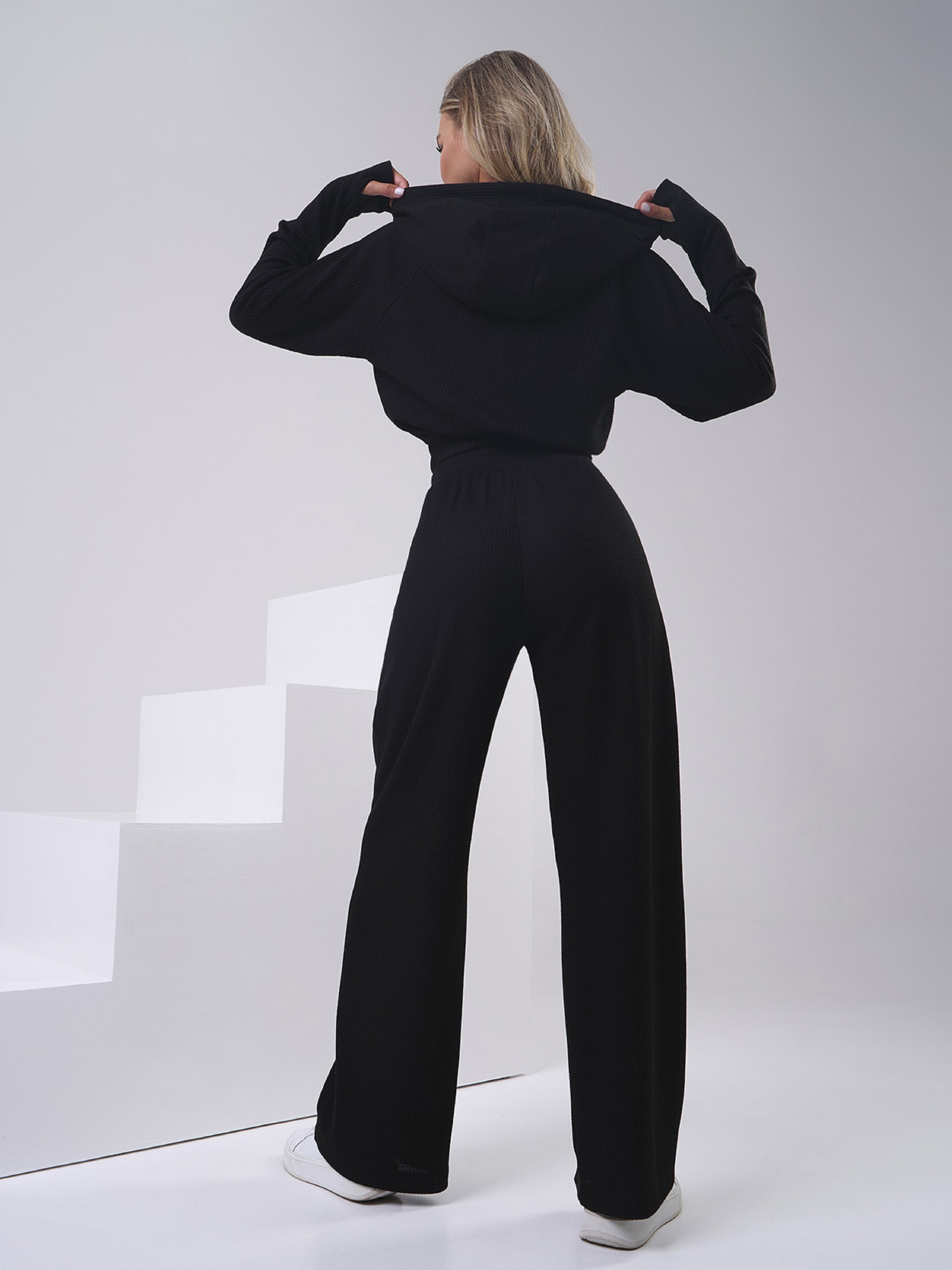Чорний молодіжний костюм у спортивному стилі, виготовлений із фактурного трикотажу. Толстовка-худі на блискавці з довгими рукавами та захисним капюшоном. Виріб короткої довжини з манжетами та вирізами для великих пальців. Високі штани з еластичною гумкою на талії, кишенями та широким прямим кроєм. Напівобхват: Кофта: Груди: S (49), M (51), L (53), XL (55), Довжина виробу - 46, Рукав - 58, Штани: Талія: S (30-40), M (32- 42), L (34-44), XL (36-46), Стегна: S (52), M (54), L (56), XL (58), Довжина виробу - 102, Довжина по внутрішньому шву - 73 , Тканина: Висока еластичність