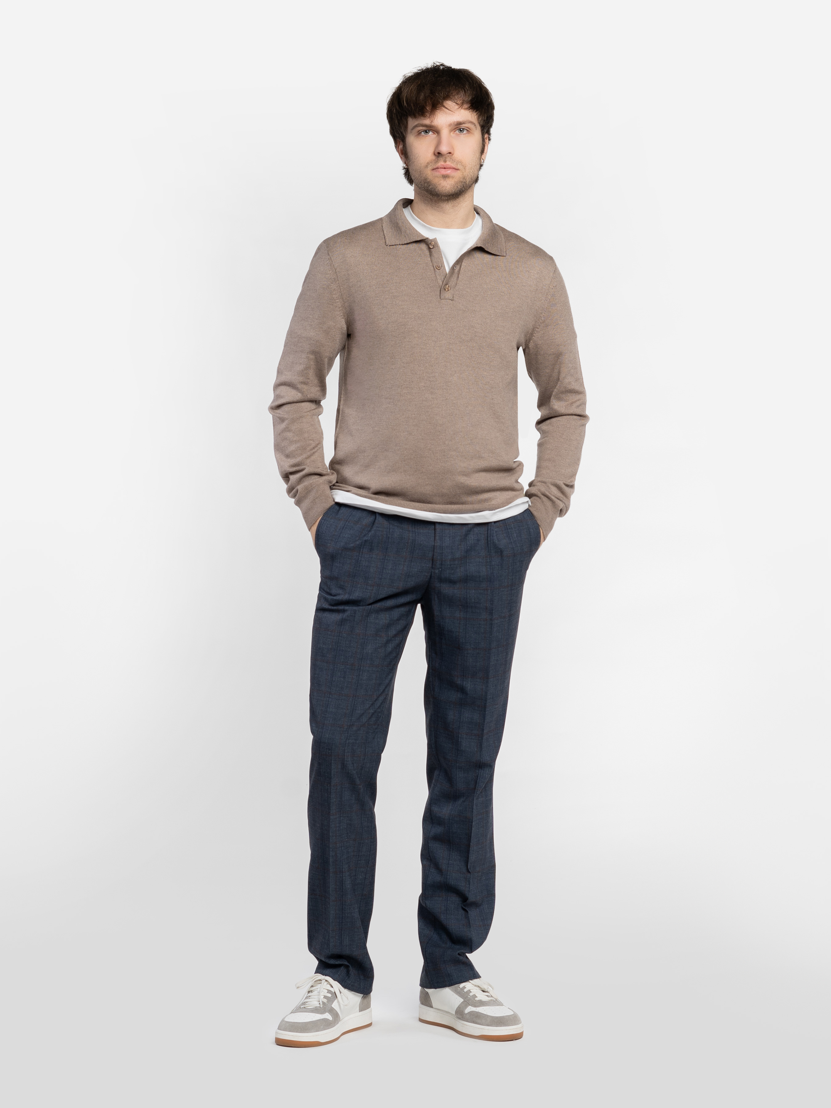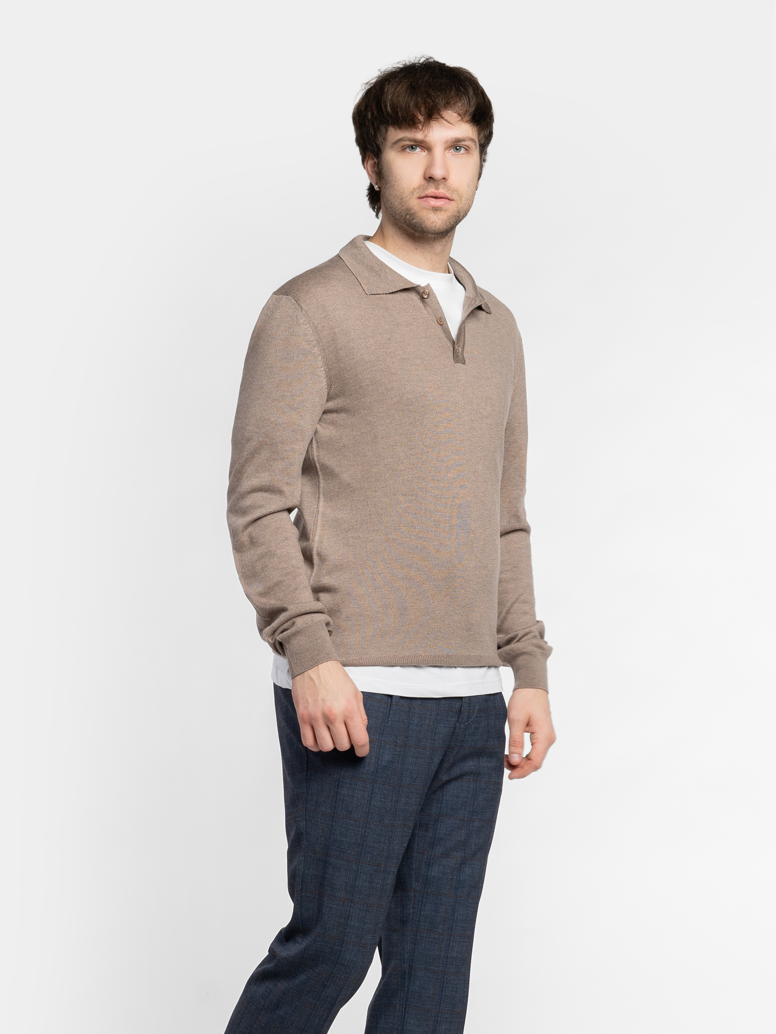 Чоловіче поло Arber бежевого кольору з тонкої бавовняної пряжі з додаванням натуральної вовни. М’яка тканина приємна на дотик, забезпечує комфорт і свободу рухів. Модель із довгими рукавами та застібкою на ґудзики додає сучасного акценту. Легко поєднується з джинсами або брюками для стильного, лаконічного образу. Модель на фото у розмірі 48. Зріст: 183 см. Параметри: 94/90/100