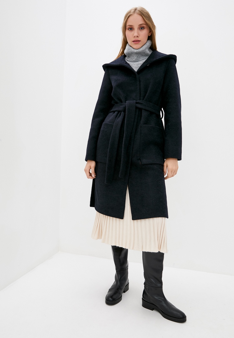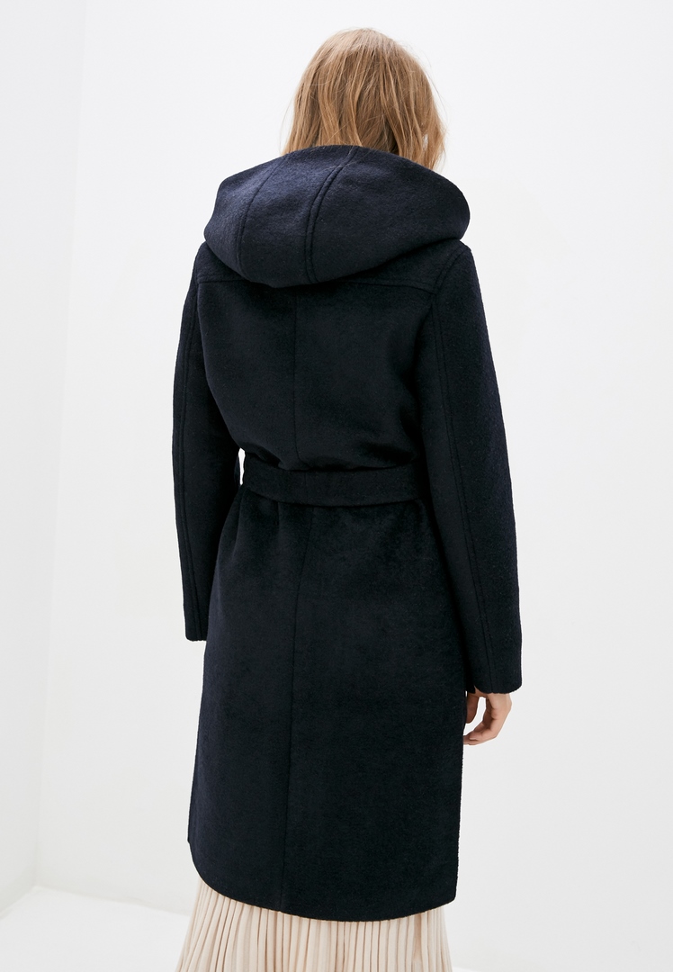 Пальто демісезонне прямого силуету. Деталі: однобортне, капюшон, бічні розрізи, спущена лінія плеча, втачной рукав, накладні кишені, застібка - потаємні кнопки і 1 гудзик. Довжина виробу - 106см. Довжина рукава - 65см Склад: Шерсть - 70%, Поліестер - 30%