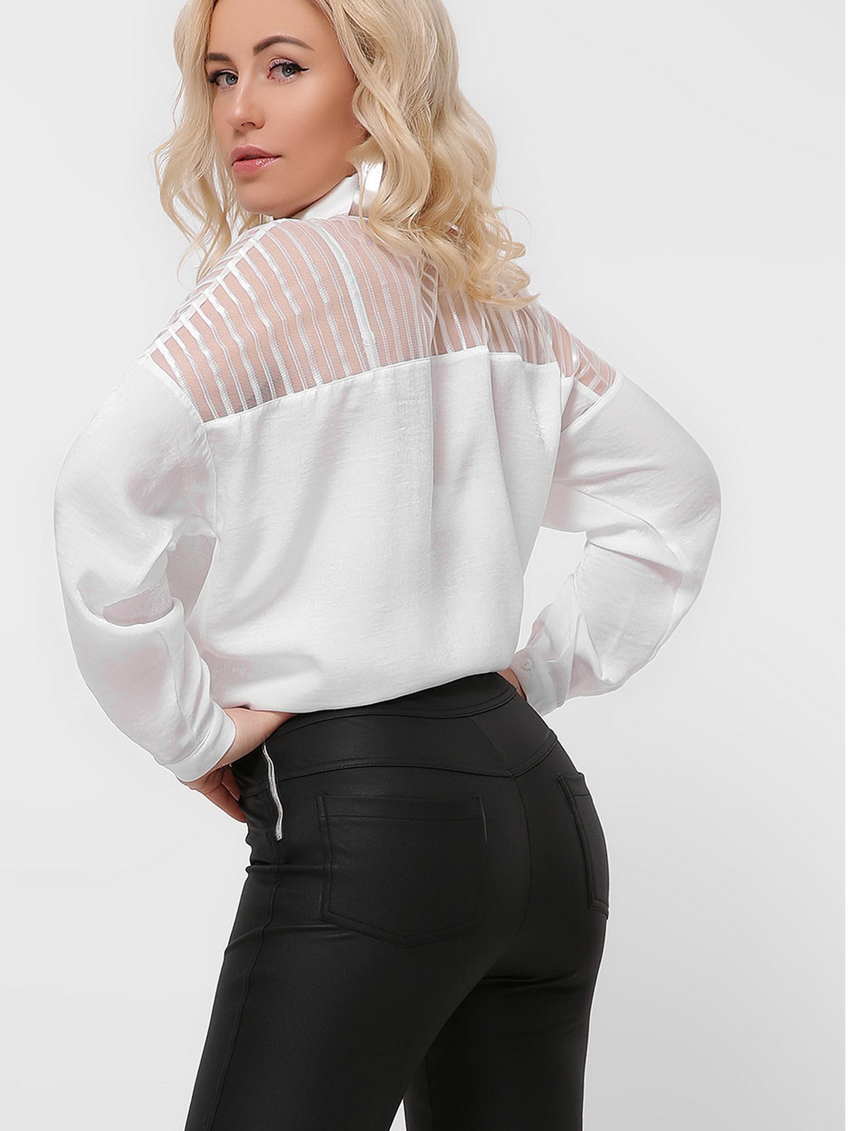 Оригінальна шовкова блузка на ґудзиках. Модель має вільний крій, стоячи-відкладний комір і довгий рукав з манжетою на гудзику. Особливість вироби, - прозорий верх з вертикальними смужками.