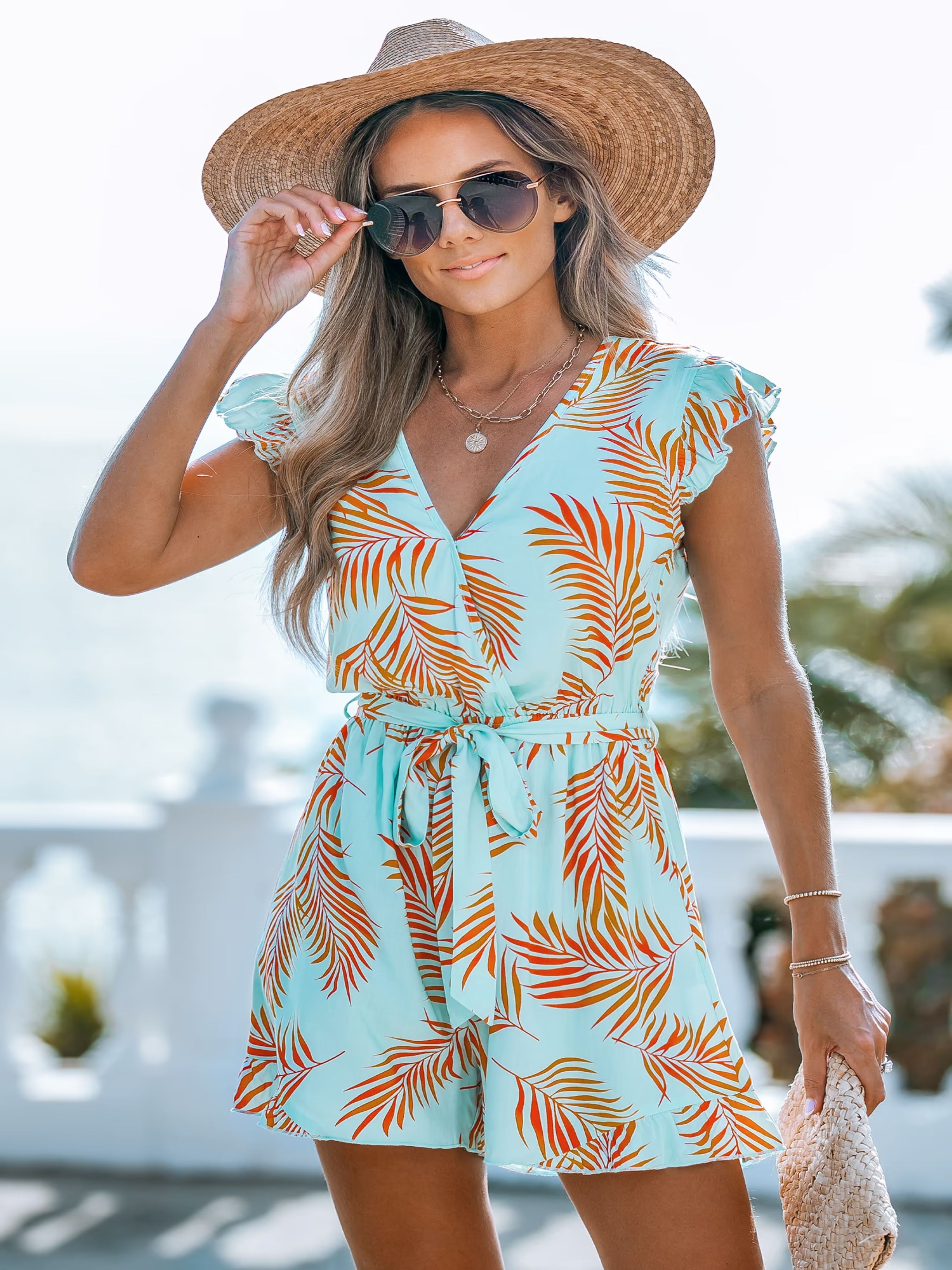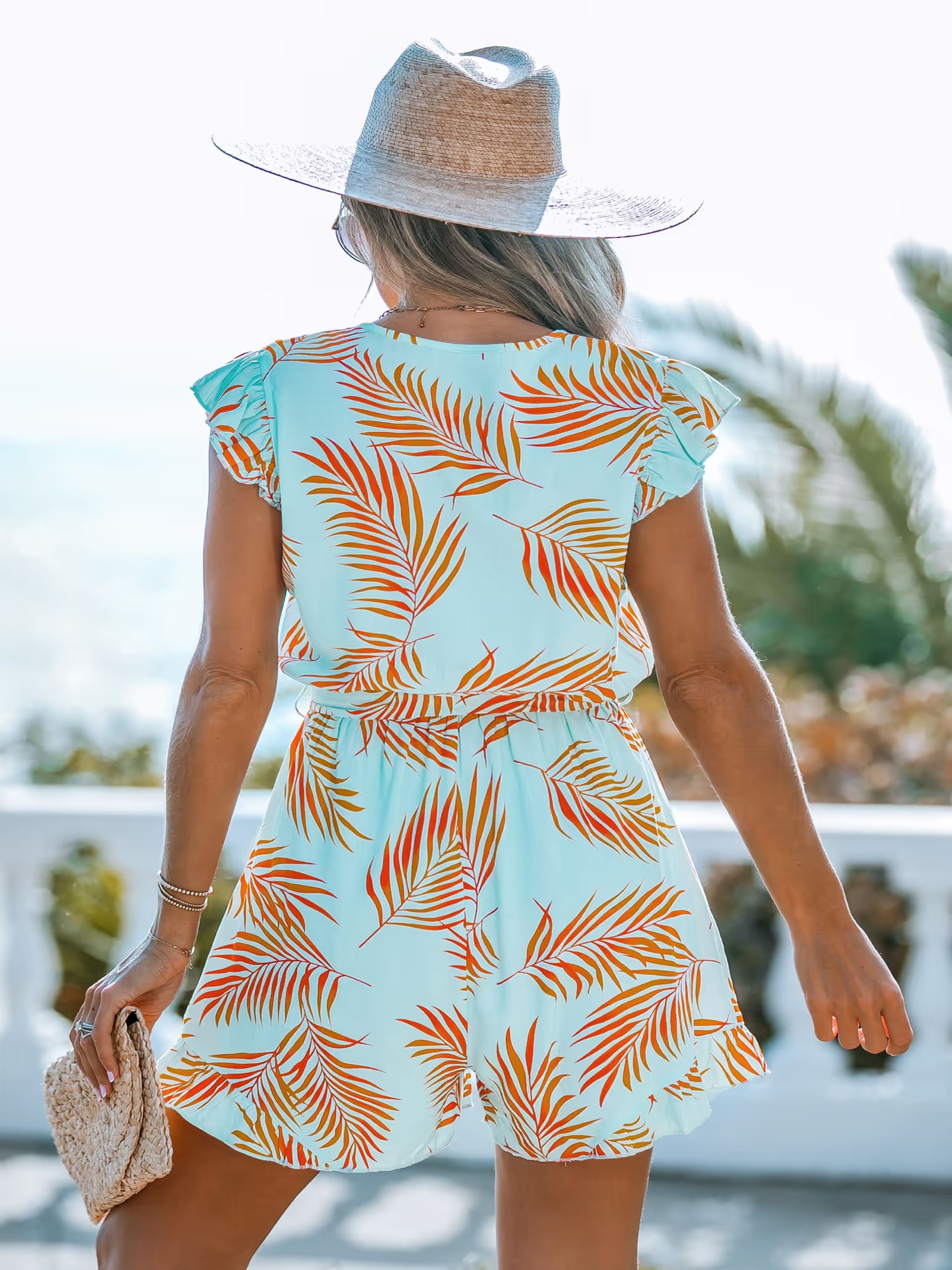 Ця річ, створена для легкої відпустки, надає зібраного вигляду з мінімальними зусиллями. Для більш вільного, розслабленого крою ми рекомендуємо брати на розмір більше. Легка та дихаюча віскоза створена для теплих днів. Вона може думати і сідати, але трохи догляду допоможе їй виглядати свіжою. Наповніть свій стиль тропічним сяйвом у нашому комбінезоні з рукавами-крильцями Teal & Orange Tropical! Ця яскрава річ без зусиль передає дух літа. Тропічний принт у кольорах бірюзи та апельсина створює екзотичну чарівність, а рукави-крильця додають грайливості та жіночності. Тканина V-подібний виріз із стилістикою Короткі рукави-крильця Зав'язка на талії Широкі штанини ***Розмір - XS Напівобхват пояса - 28,00 см Довжина виробу - 70,00 см Об'єм грудей - 72,00 см Напівобхват стегон - 47,00 см Склад: 100% віскоза