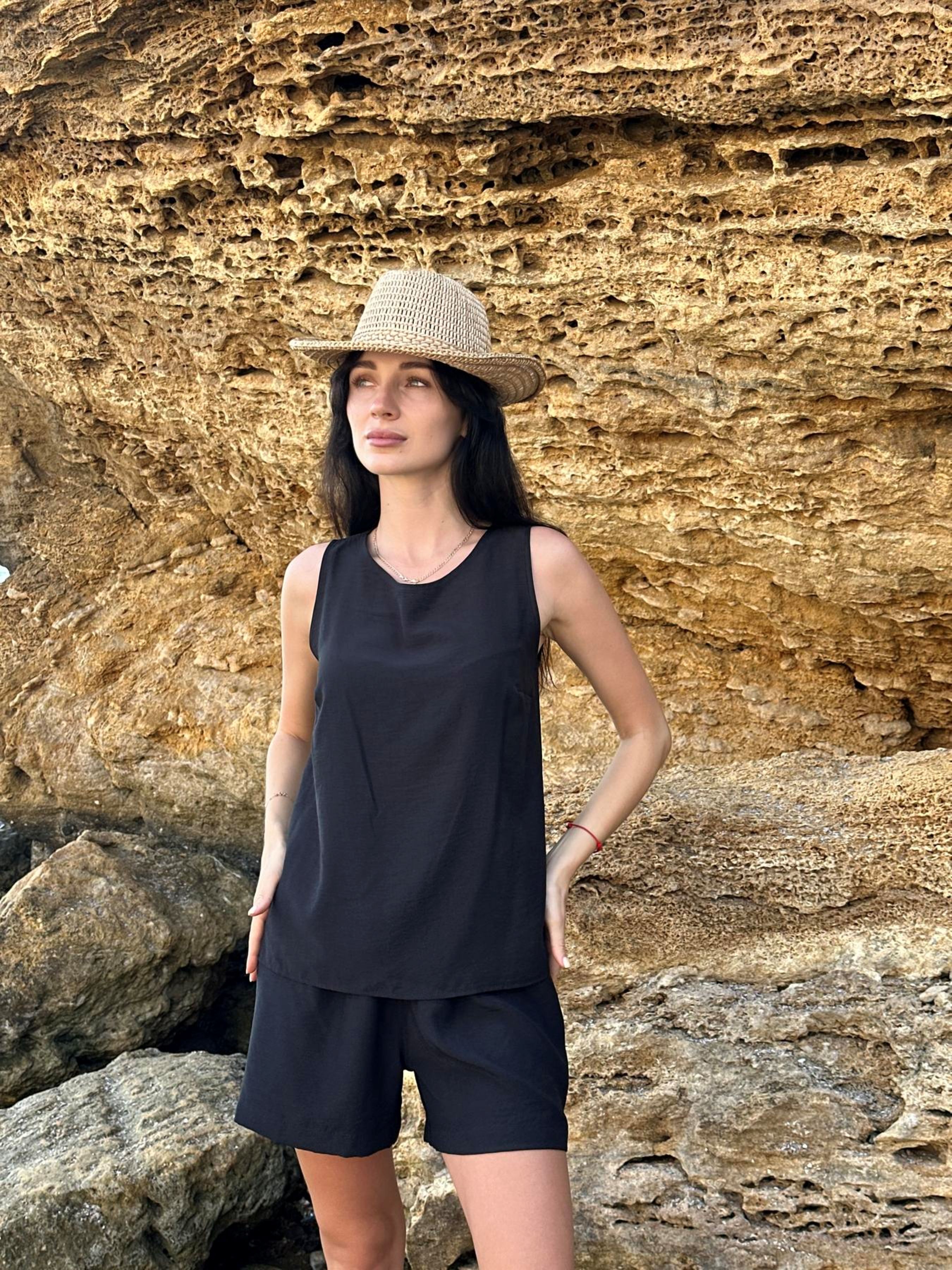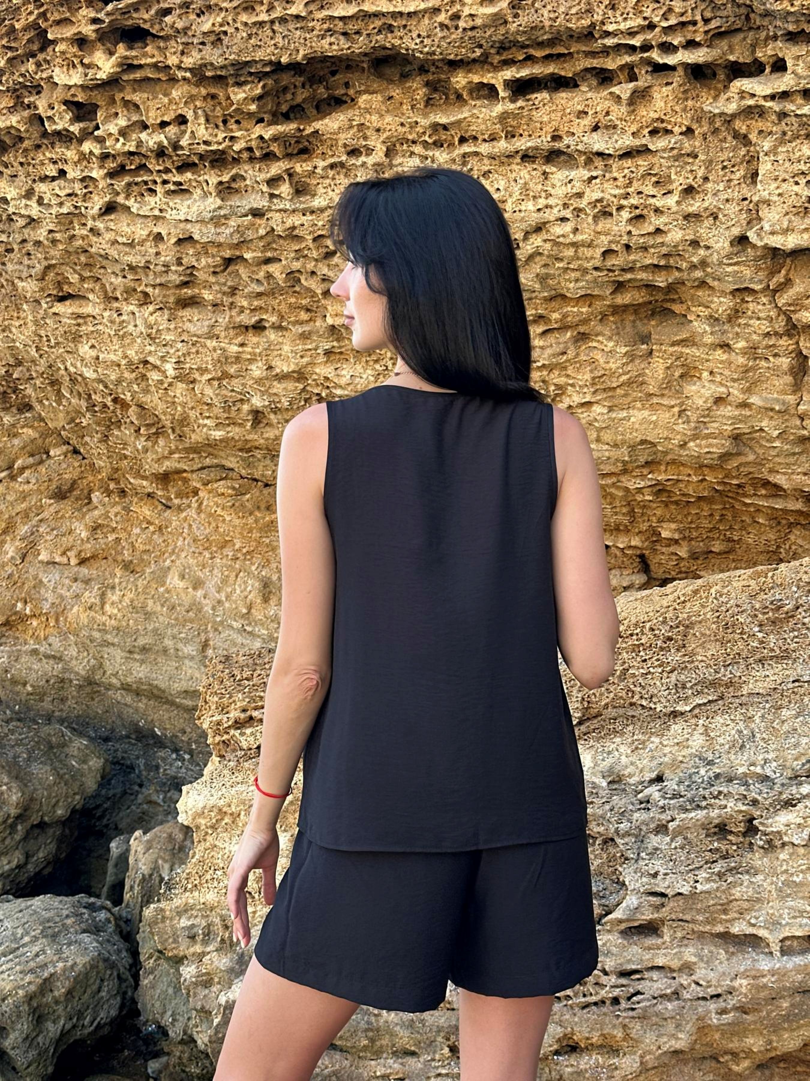 Базовий чорний комплект з колекції LUMIA — стильне рішення для літа, яке поєднує комфорт, елегантність і універсальність. Легка, шовковиста тканина м’яко струмує по тілу, не просвічується та приємна до шкіри. Вільна майка дарує свободу рухів, а шорти на зручній резинці забезпечують комфортну посадку, не сковуючи талію. Глибокий чорний колір додає образу стриманої вишуканості та легко комбінується з будь-якими аксесуарами чи взуттям. Ідеально підійде для відпочинку на морі, вечірньої прогулянки чи навіть літньої вечірки. Комплект можна носити як разом, так і окремо: майка чудово поєднується зі спідницею або штанами, а шорти — з топами чи сорочками. Тканина: шовк-віскоза Склад: 50% поліестер, 50% віскоза Щільність: 105 г/м² Колір: чорний Розміри: s-m, l-xl
